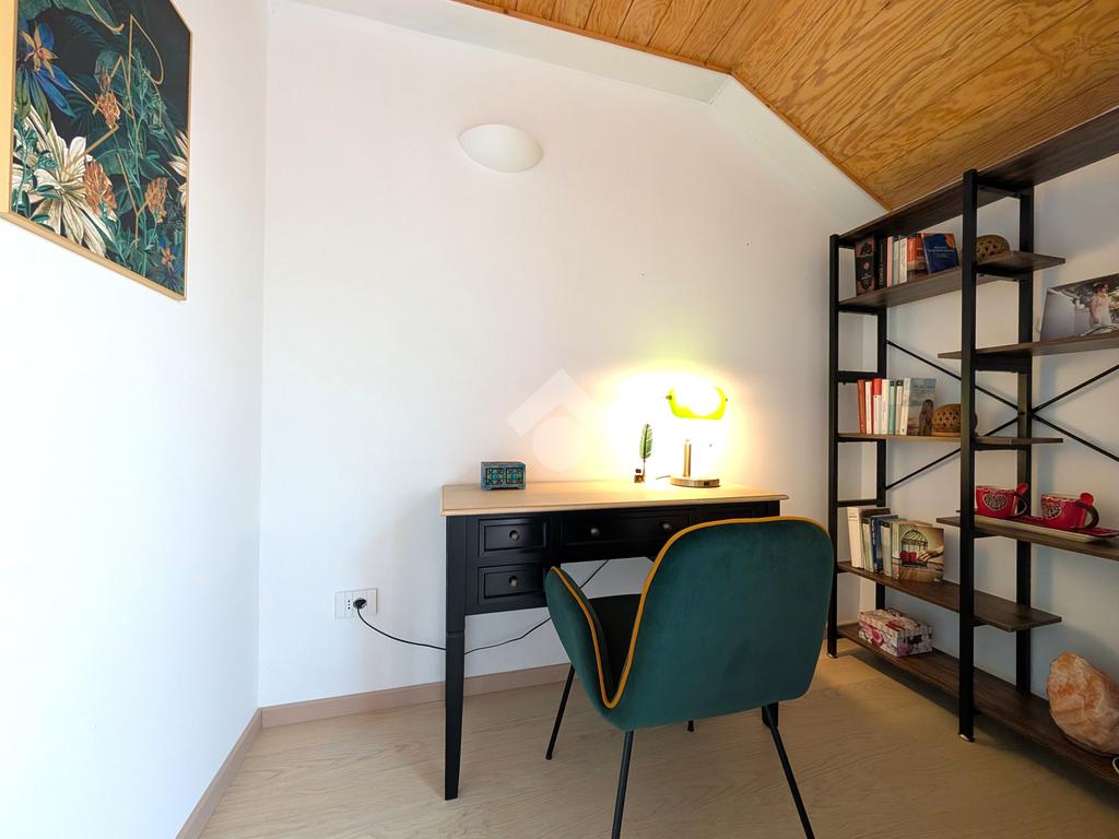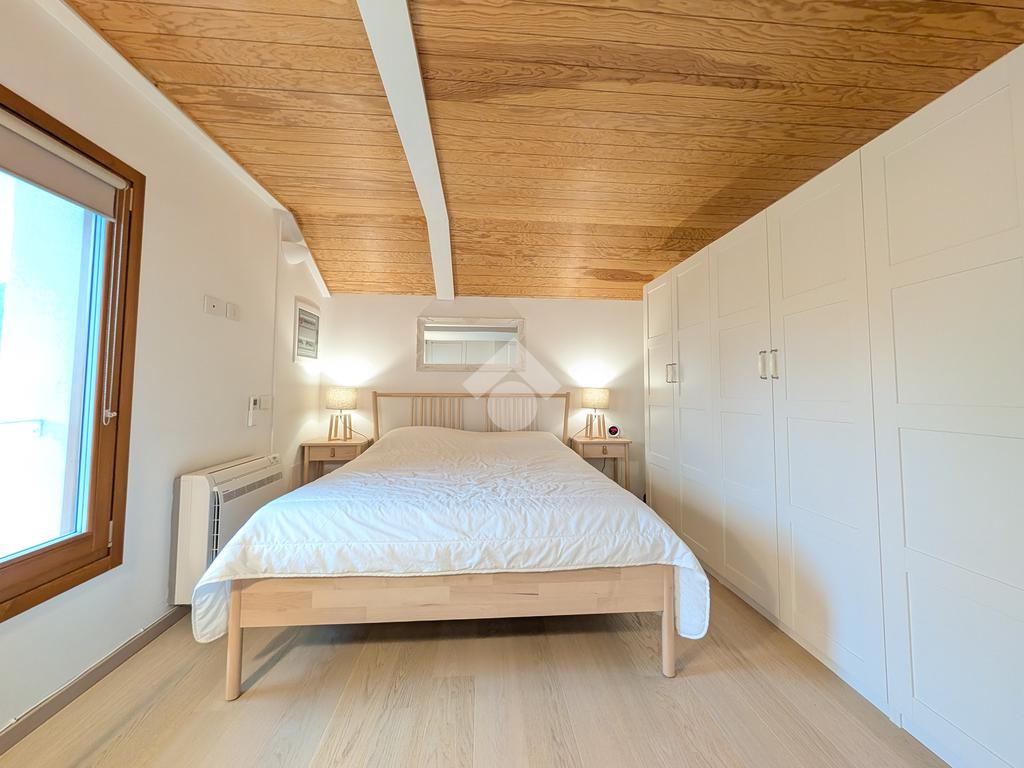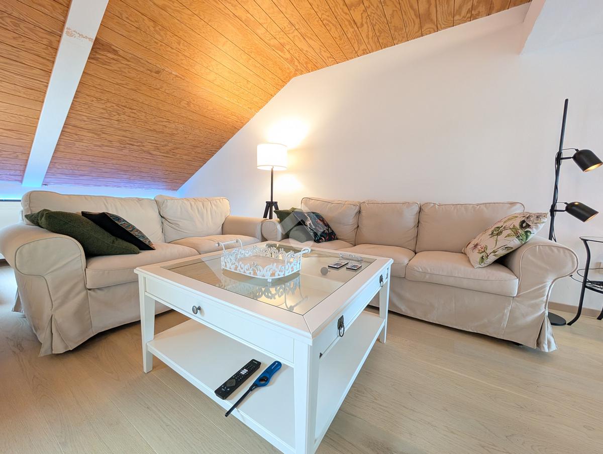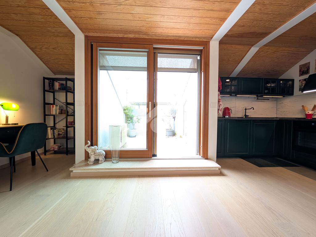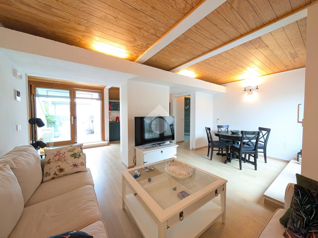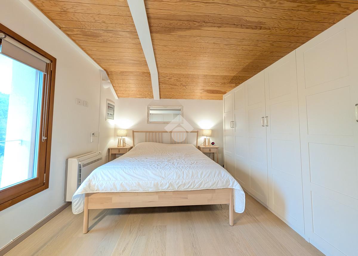 Situato al primo piano di un contesto ordinato e ben mantenuto, l'appartamento si sviluppa su un unico livello mansardato, recentemente ristrutturato con attenzione ai dettagli. L'ingresso conduce a un’ampia e luminosa zona giorno, composta da soggiorno con angolo TV, cucina a vista e uno spazio dedicato allo studio, completo di scrivania e libreria, ideale per il lavoro da remoto. L’ambiente è ulteriormente valorizzato da due terrazzi a tasca, entrambi abitabili e con gradevoli scorci di vista lago. Su uno dei terrazzi è stato realizzato un comodo ripostiglio adibito a lavanderia.